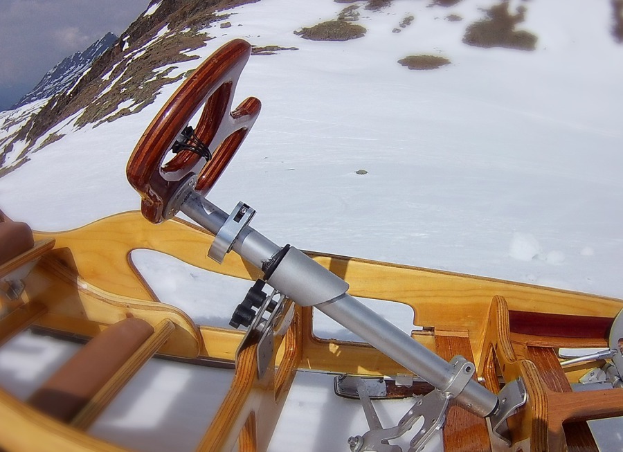 Wer würde schon gern seinen Wagen im Stadtverkehr mit den Fersen oder durch Gewichtsverlagerung lenken? Deshalb hat der Svensonschlitten ein Lenkrad, mit dem das Lenkverhalten, das dem eines Autos sehr ähnlich ist!